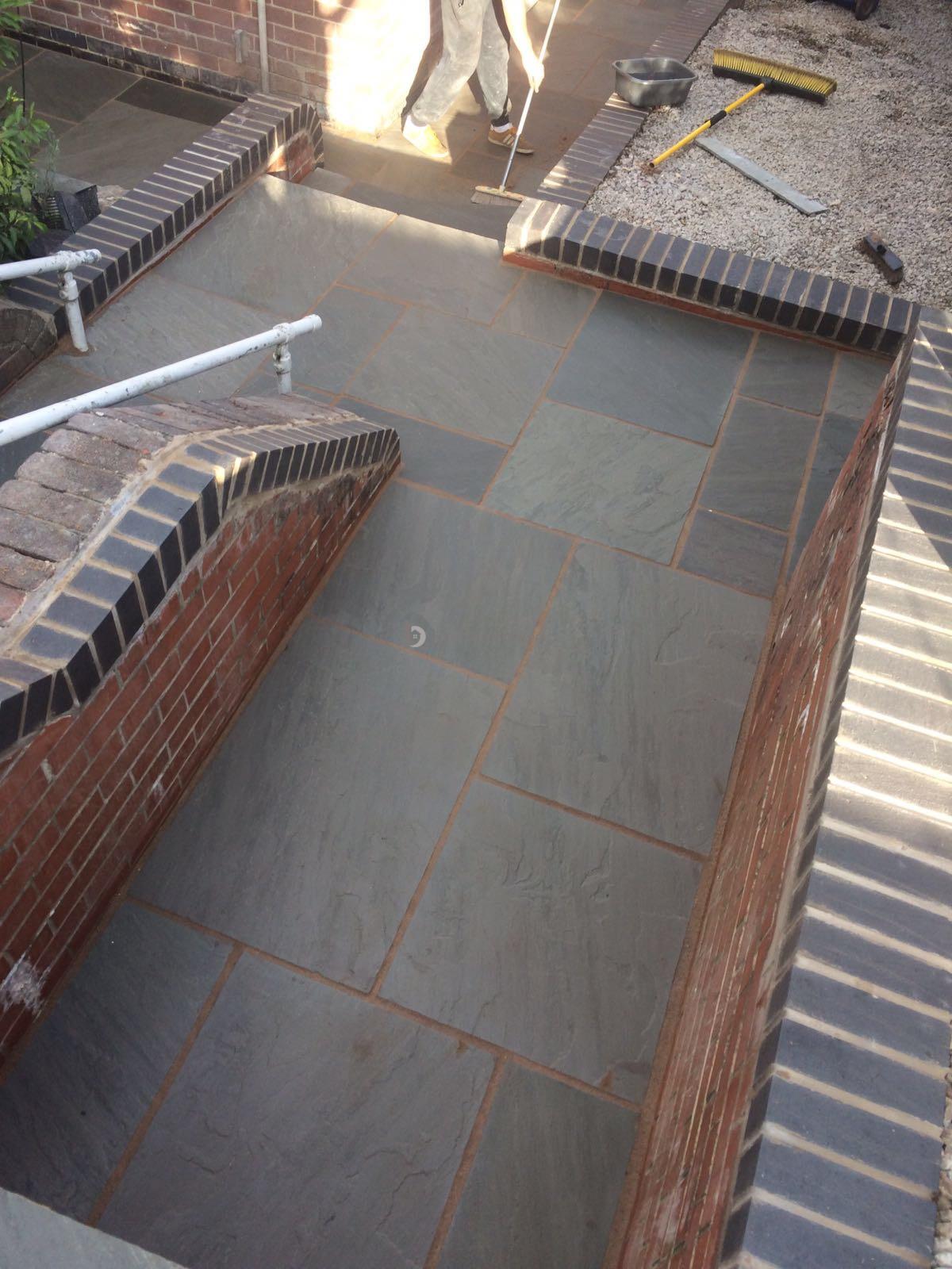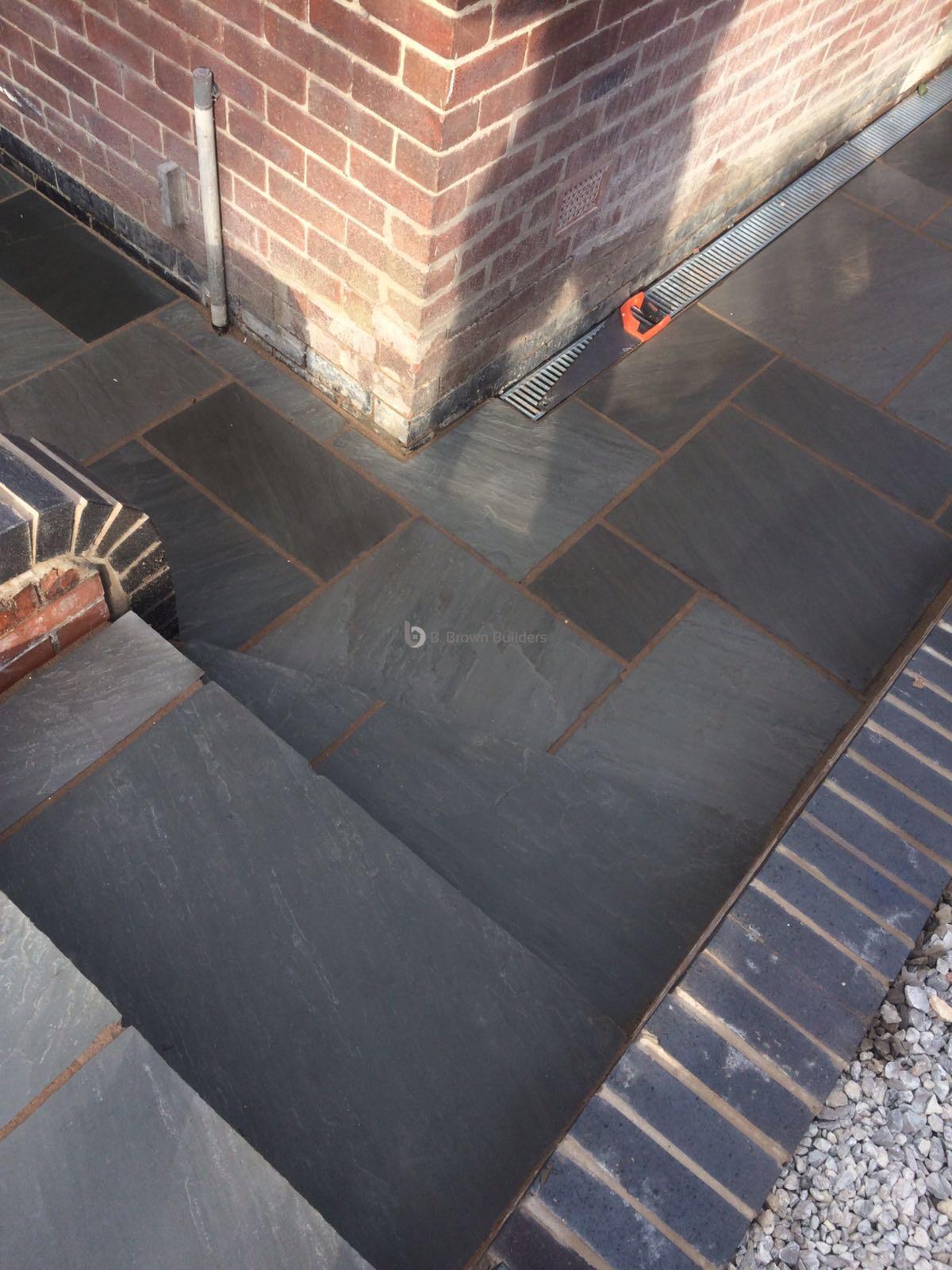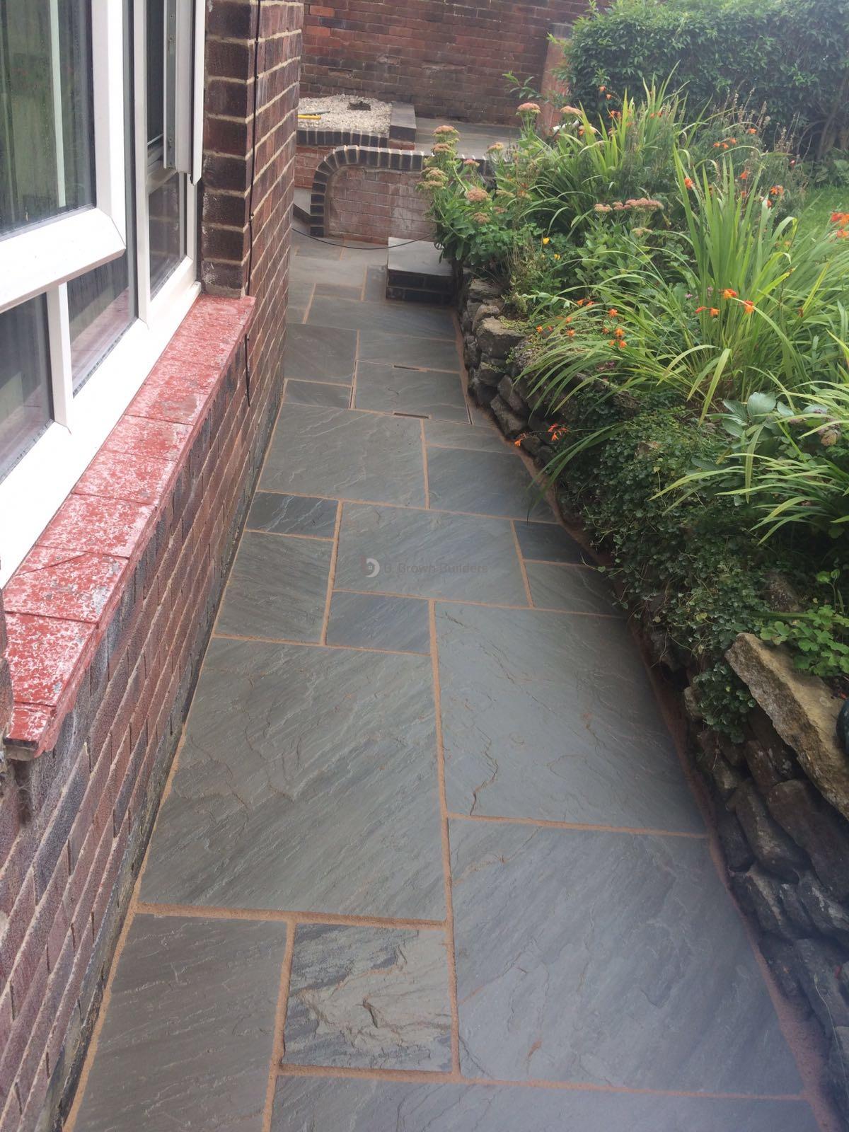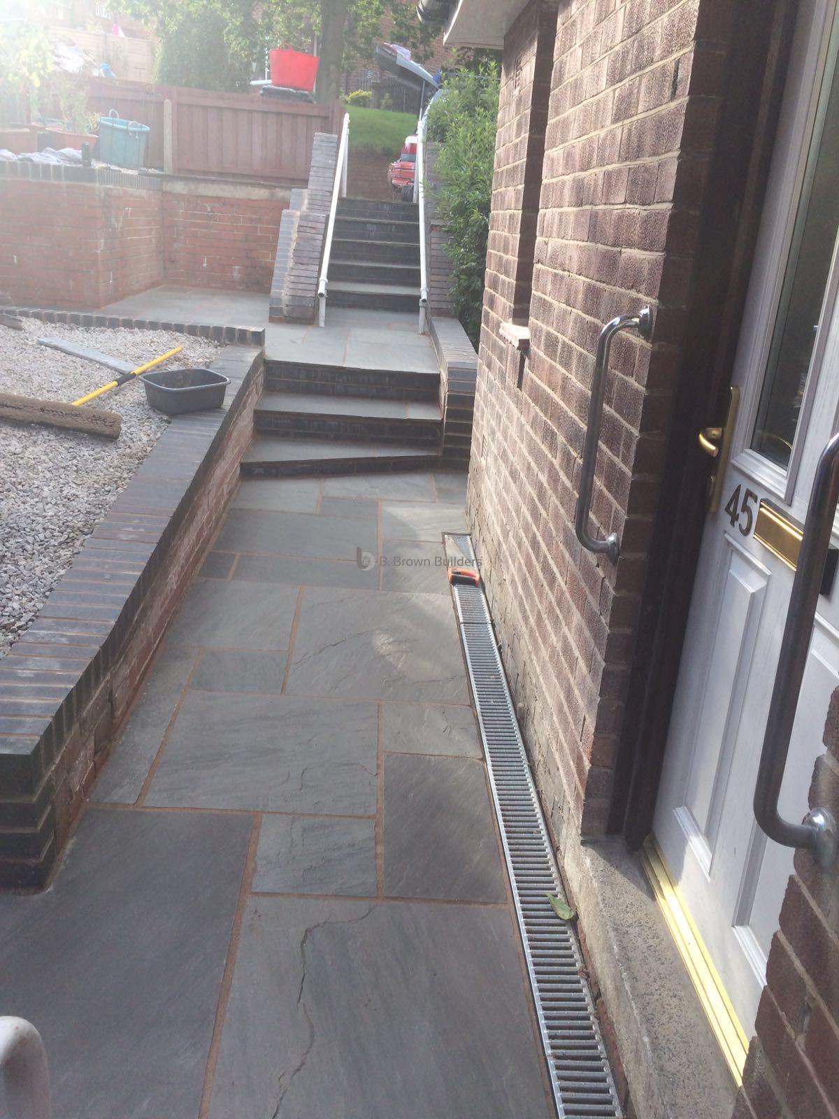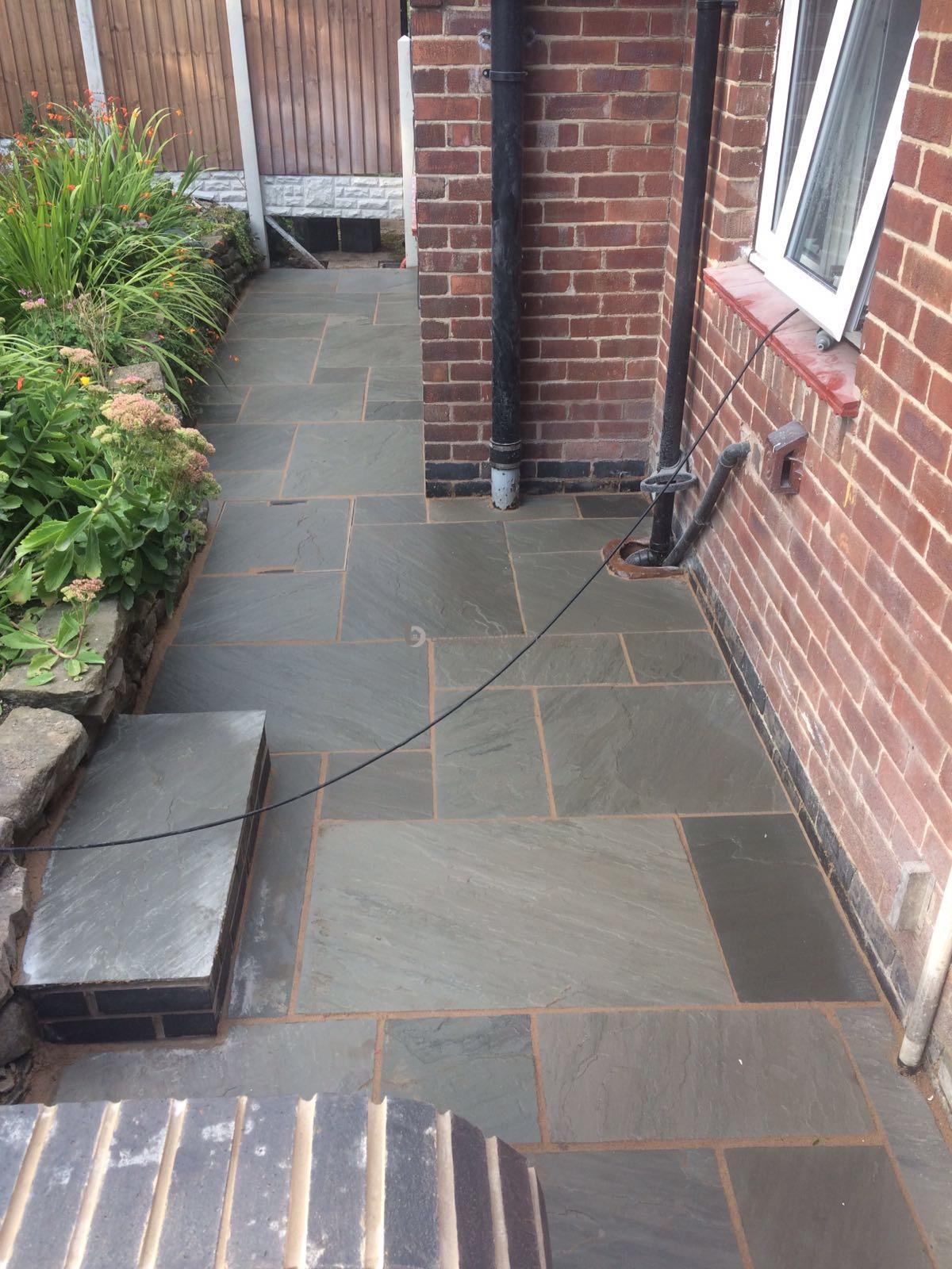 - Installed arco drains, new kandla grey Indian stone walkways, patio and steps and finished with buff jointing compound and natural sealer