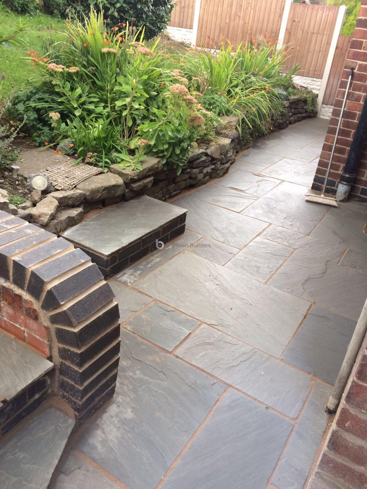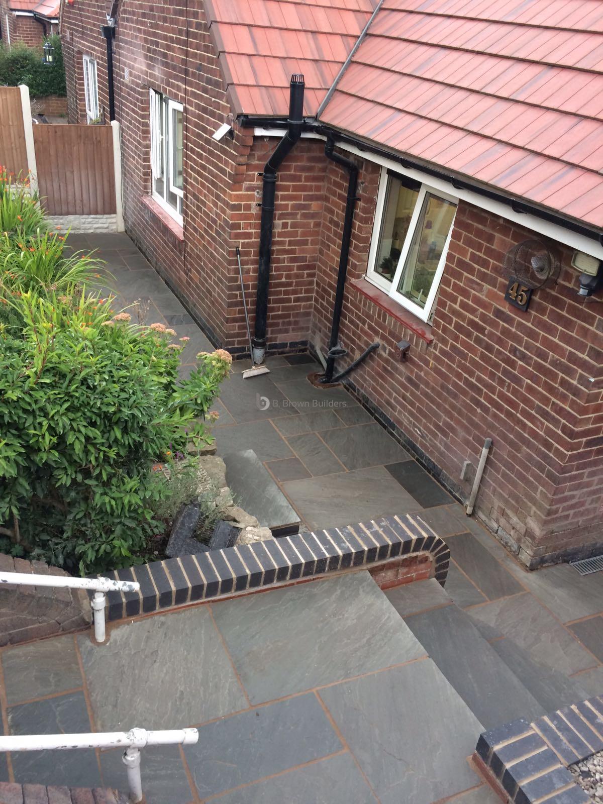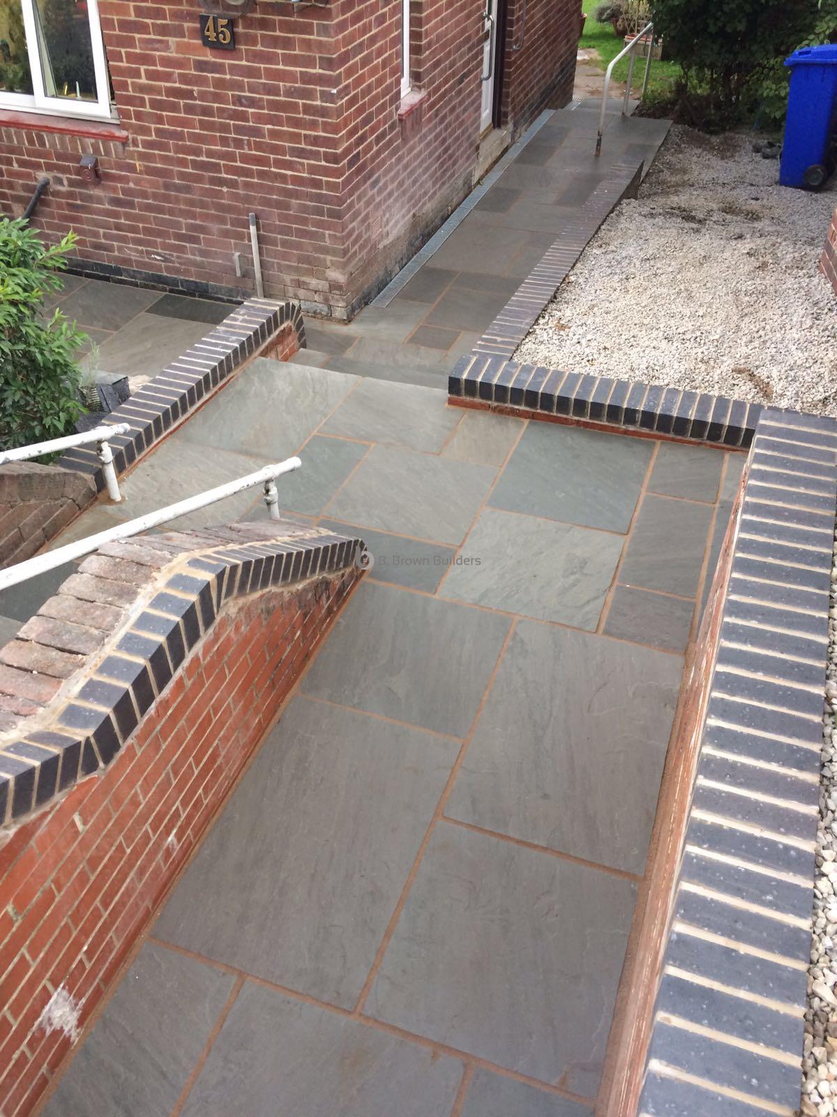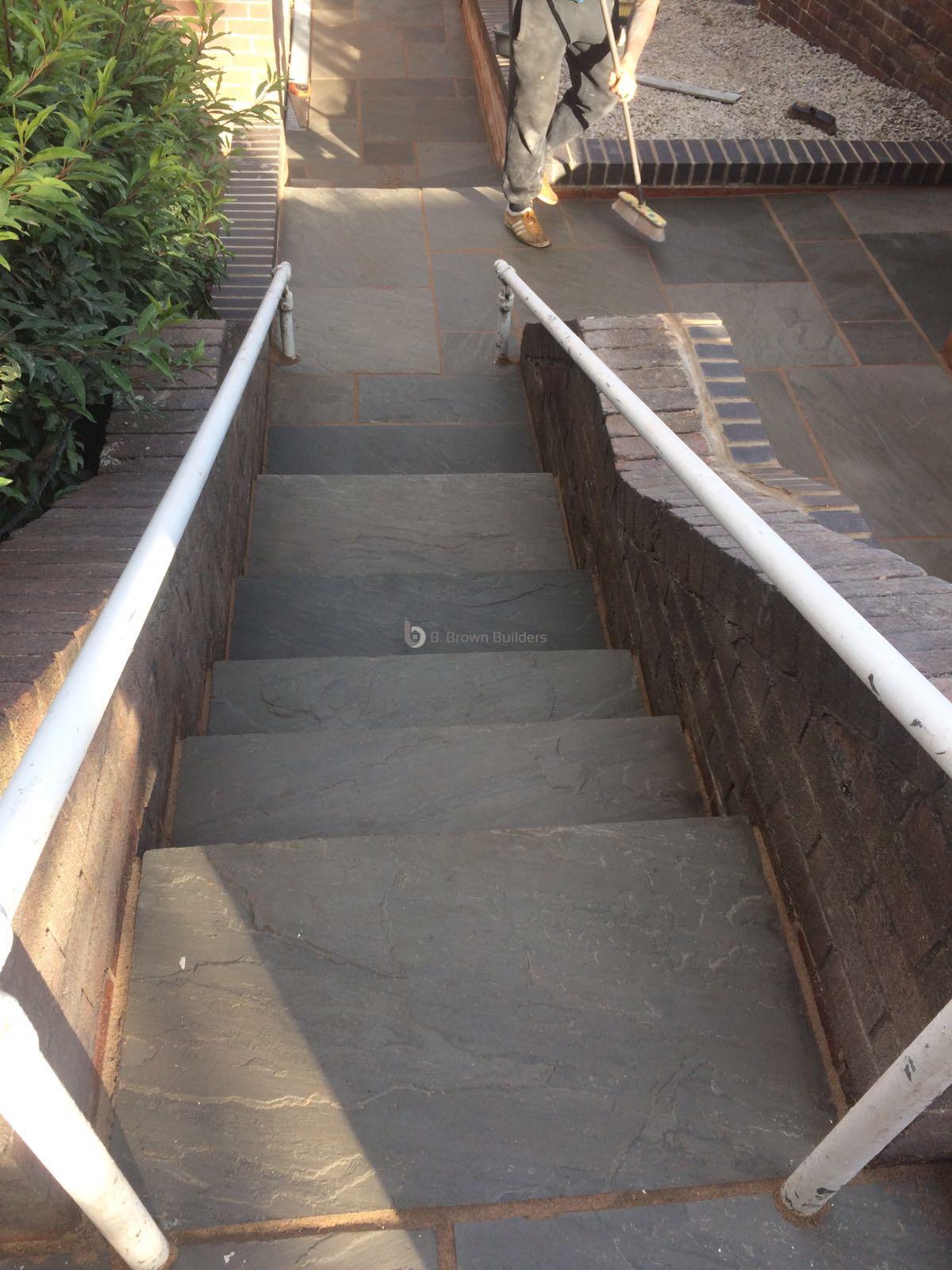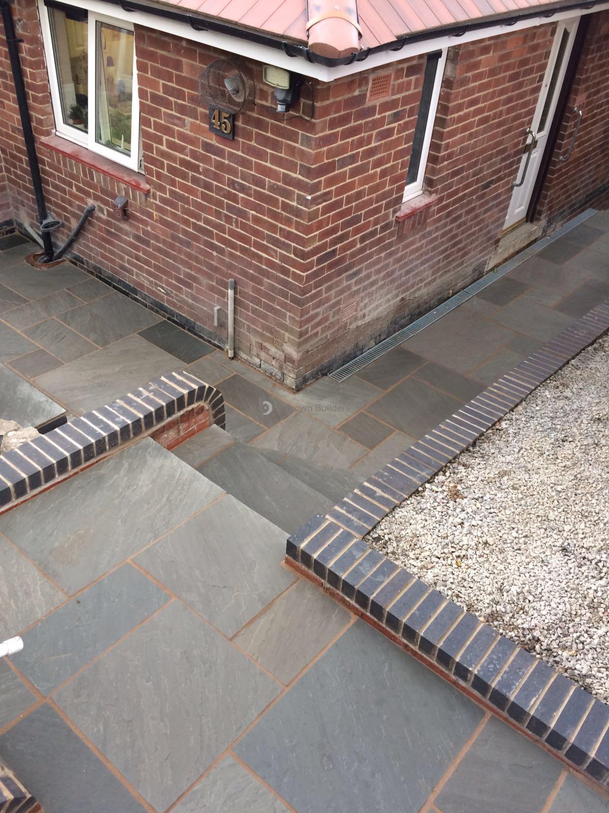 - Installed arco drains, new kandla grey Indian stone walkways, patio and steps and finished with buff jointing compound and natural sealer