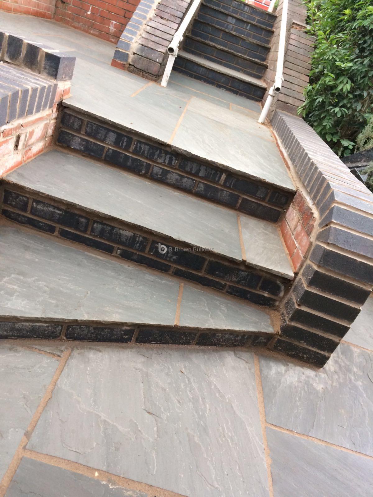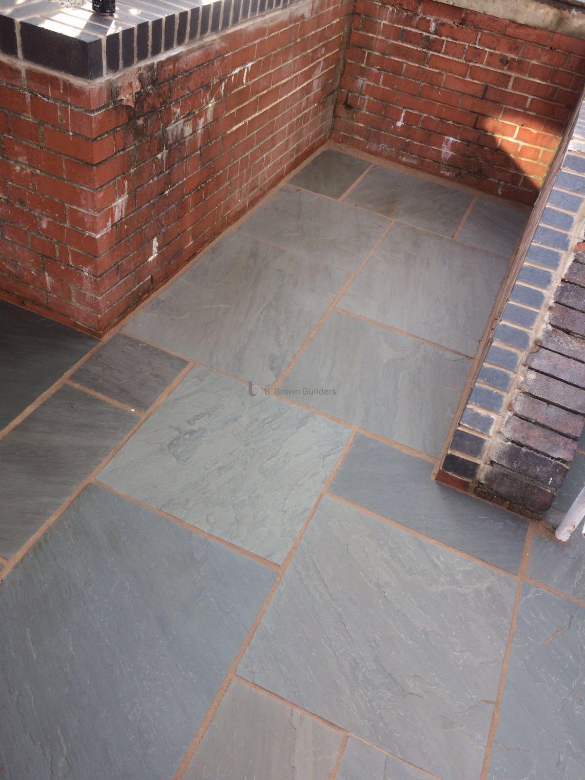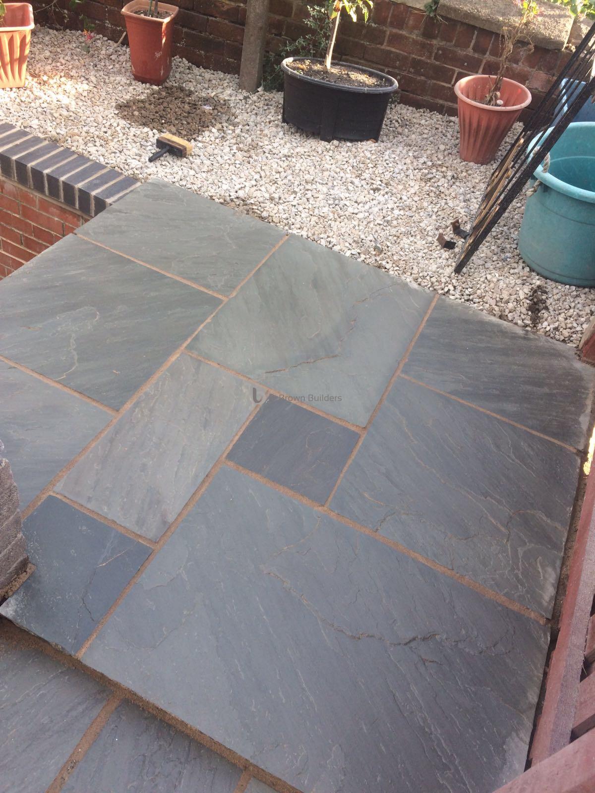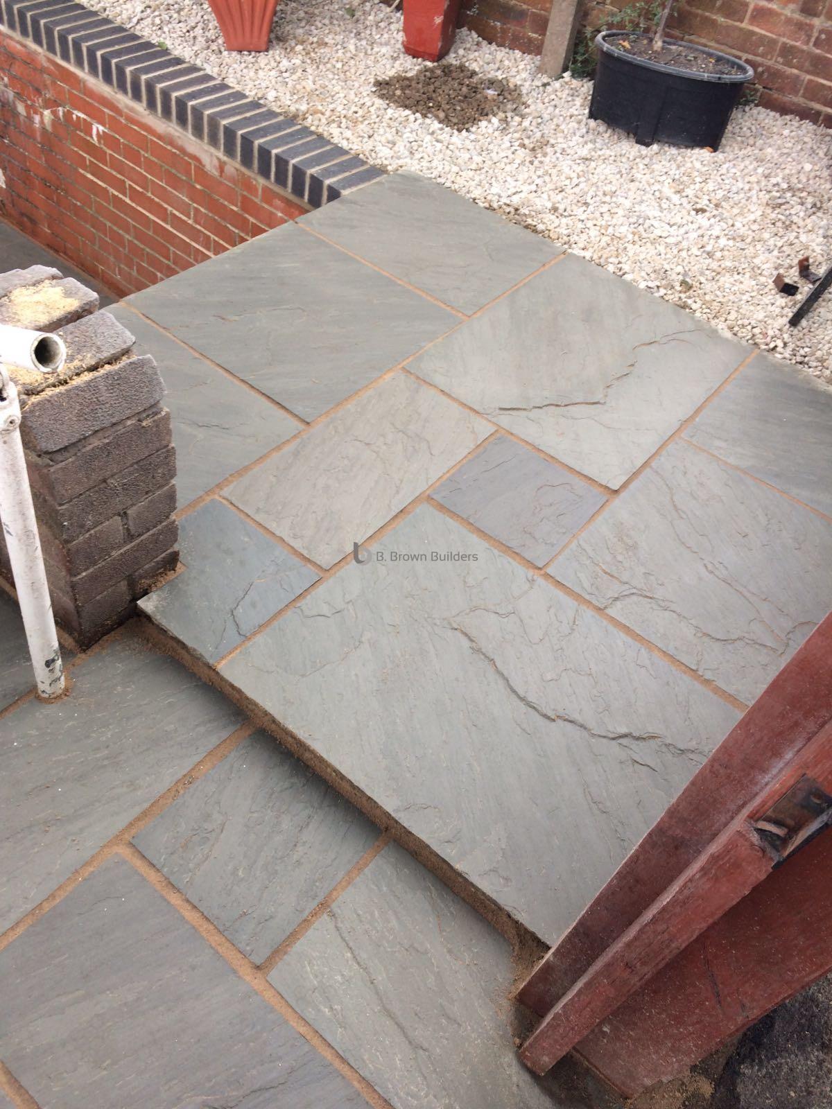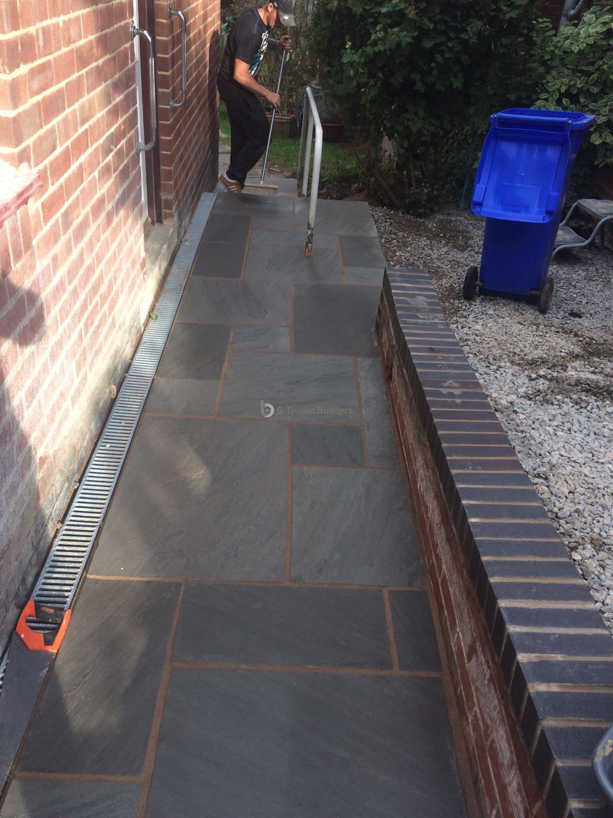- Installed arco drains, new kandla grey Indian stone walkways, patio and steps and finished with buff jointing compound and natural sealer