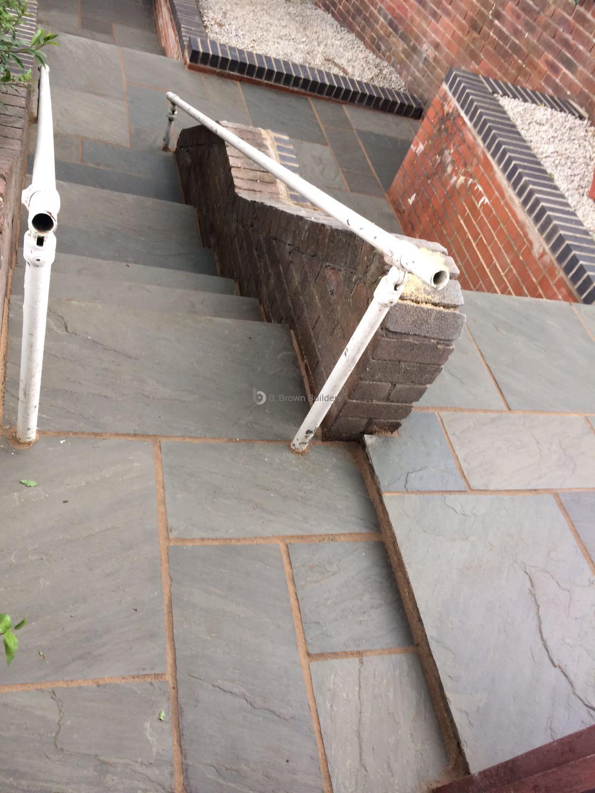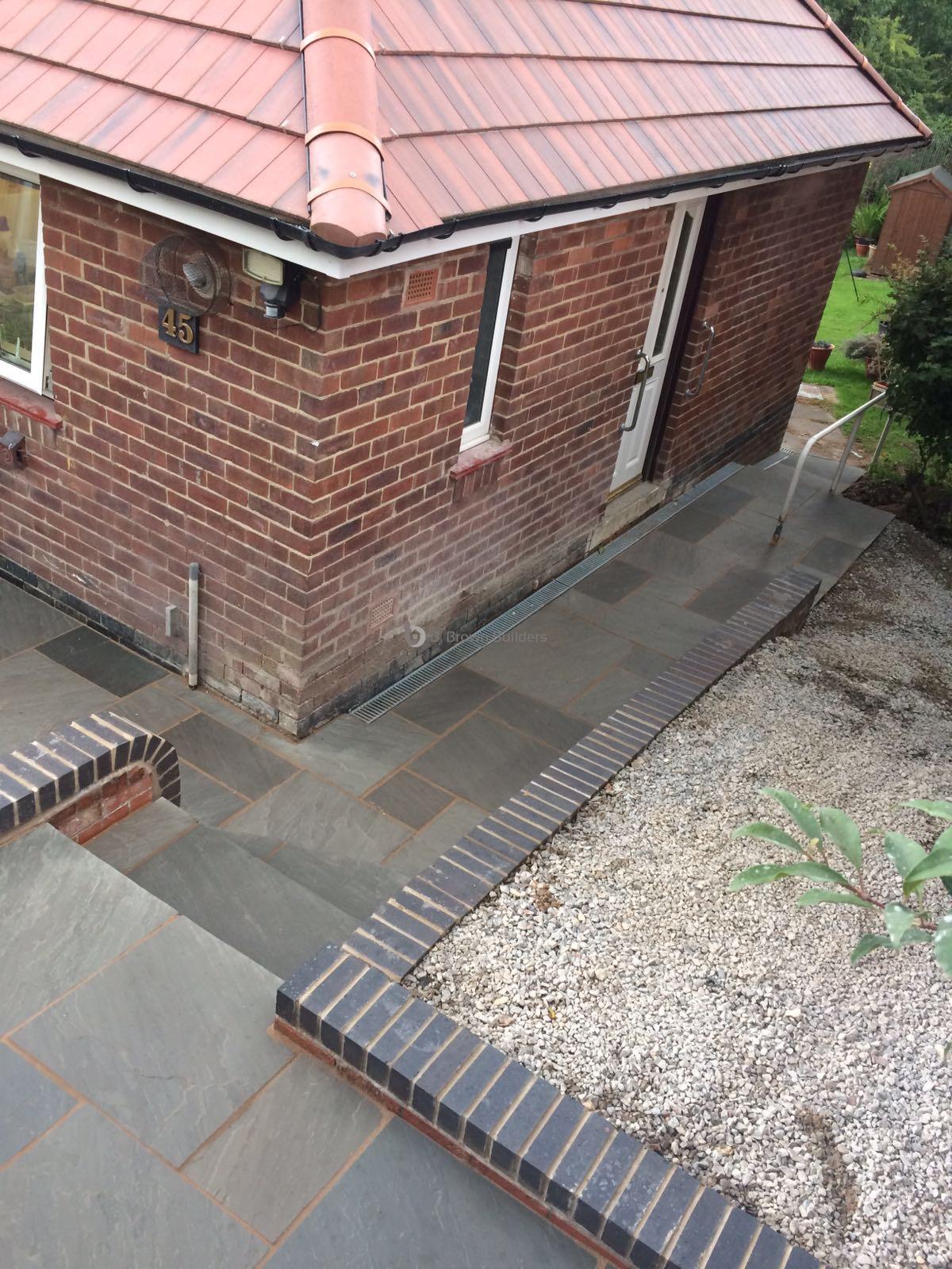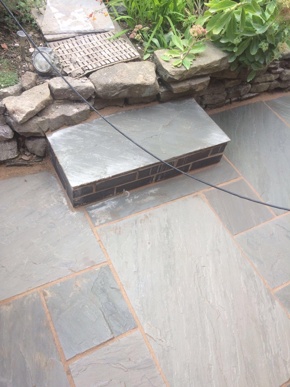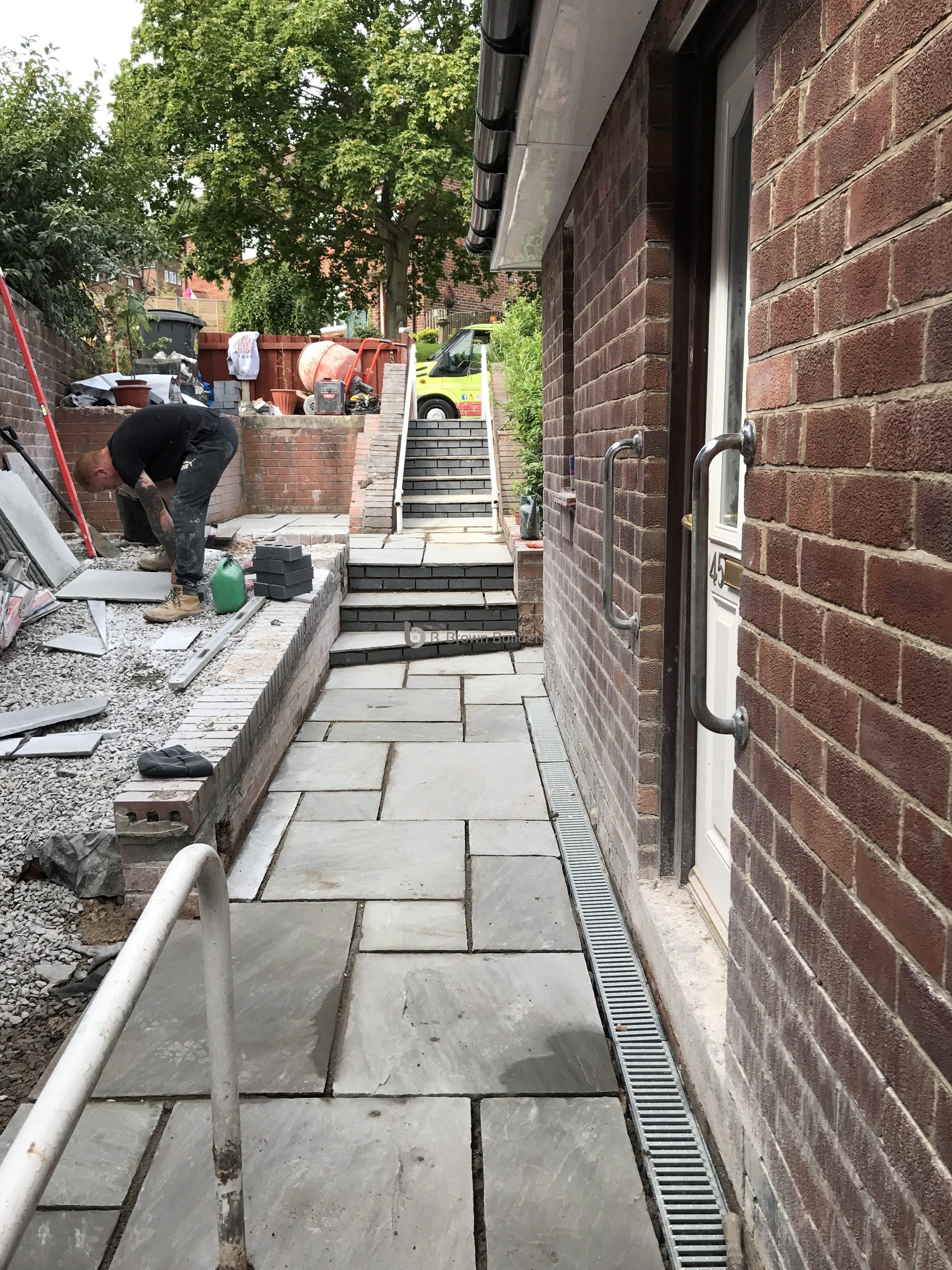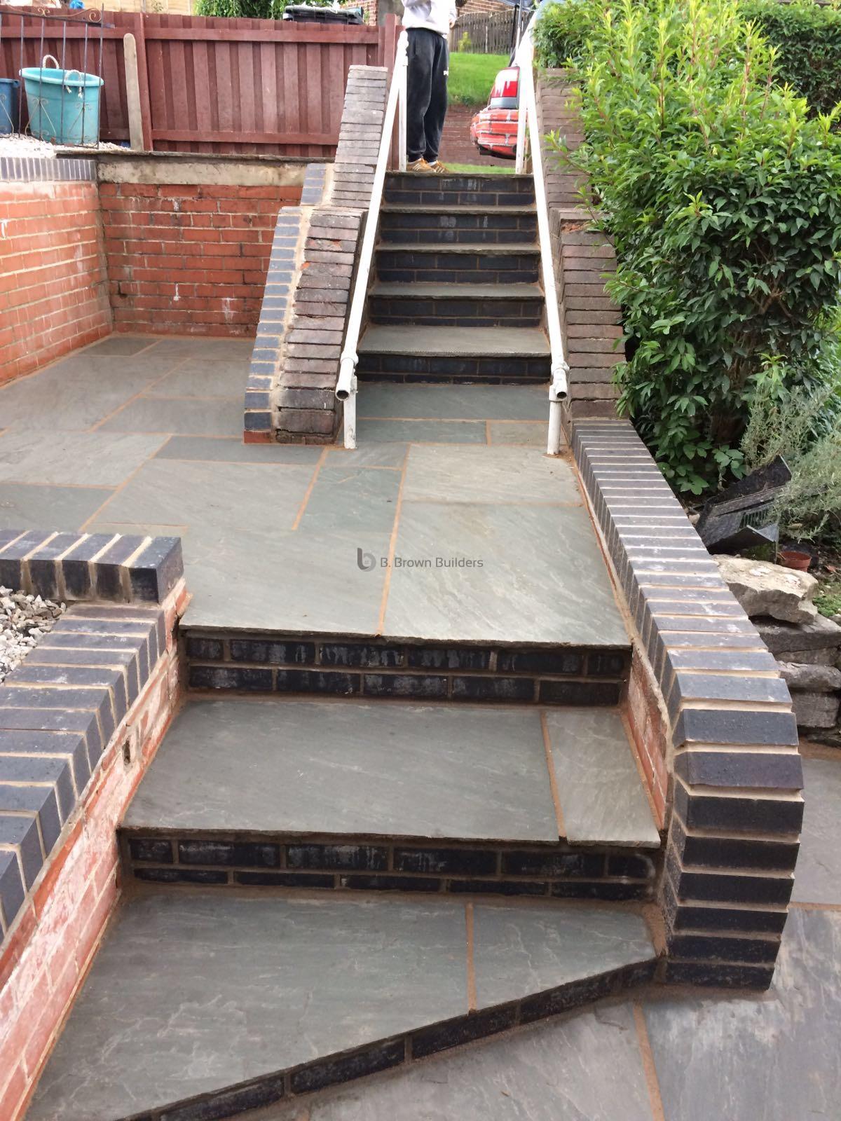 - Installed arco drains, new kandla grey Indian stone walkways, patio and steps and finished with buff jointing compound and natural sealer